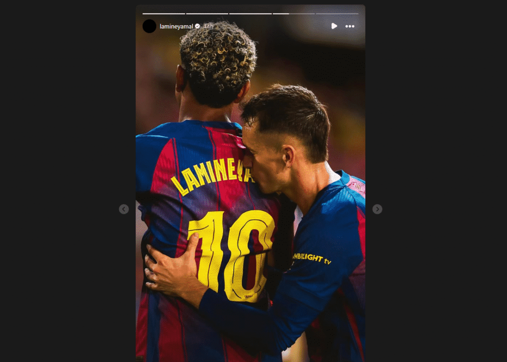 Lamine Yamal took to his Instagram Story to share a touching photo featuring teammate Marc Casadó kissing Yamal’s jersey — a gesture that radiated mutual respect and friendship between the pair. The image, now making waves across social media, perfectly captures the growing camaraderie inside Hansi Flick’s exciting young Barça squad.