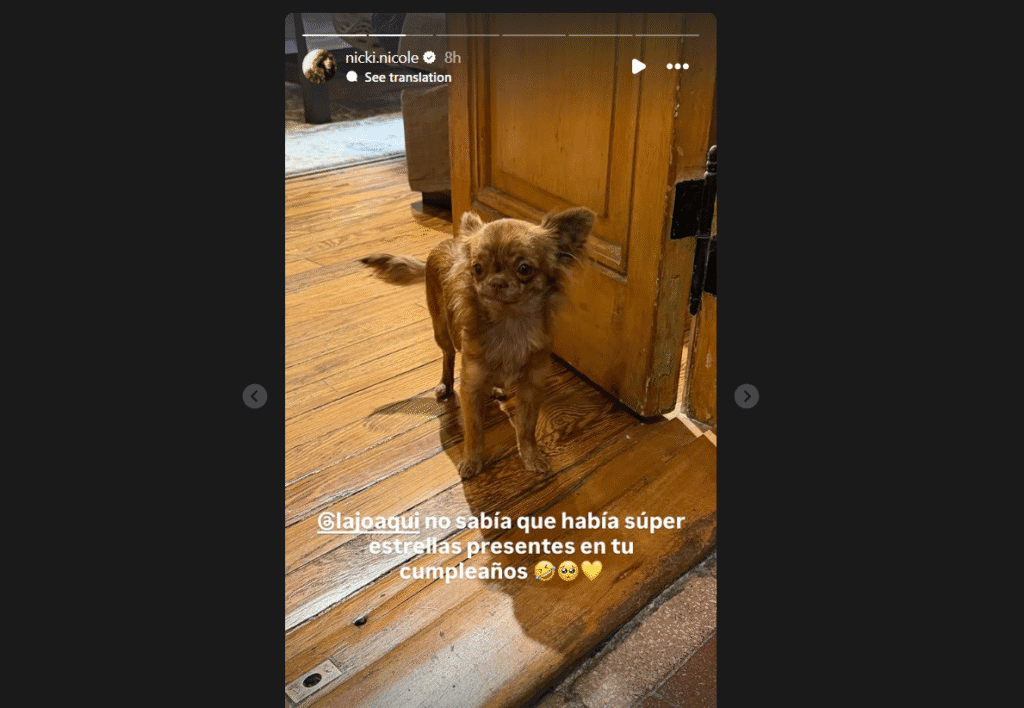 In one of her Stories, Nicole posted a picture of her dog alongside a caption written in Spanish: “Lajoaqui no sabía que había súper estrellas presentes en tu cumpleaños”, which translates to